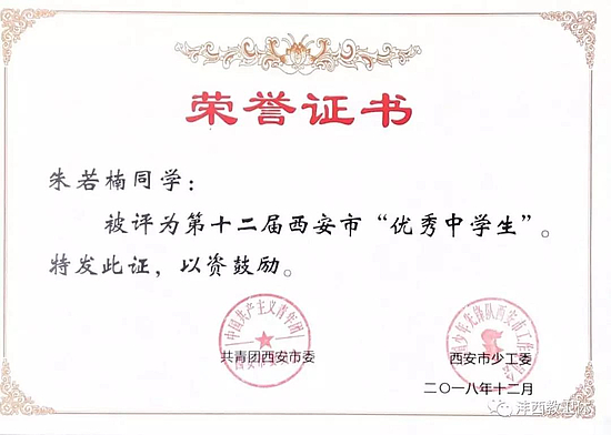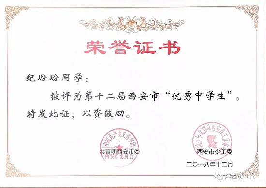 11.近日,沣西新城团委联合教育卫体局推荐的两名学生在共青团西安市委、西安市少工委联合开展的第十二届“西安市十佳中学生”“西安市优秀中学生”评选活动中获得西安市“优秀中学生”称号。