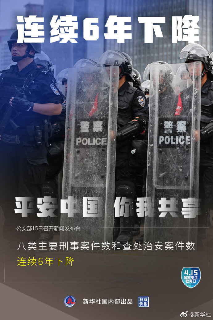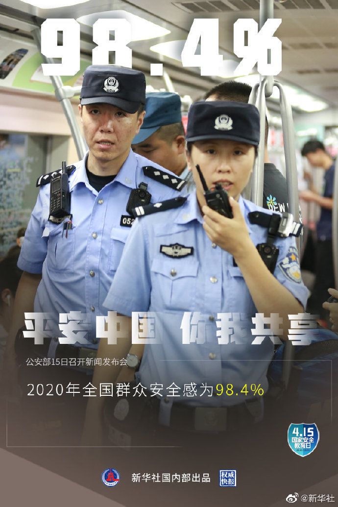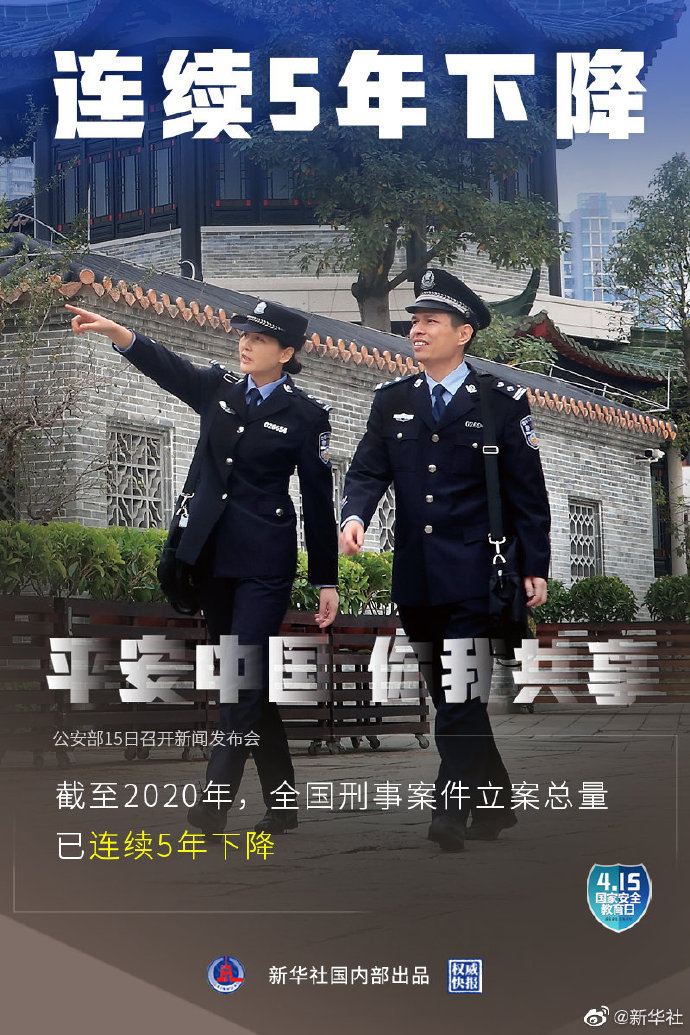 4月15日是第六个全民国家安全教育日,公安部15日召开新闻发布会介绍:2020年全国群众安全感为98.4%,全国居民对社会治安满意度达83.6%。截至2020年,全国刑事案件立案总量连续5年下降,八类主要刑事案件数和查处治安案件数连续6年下降。