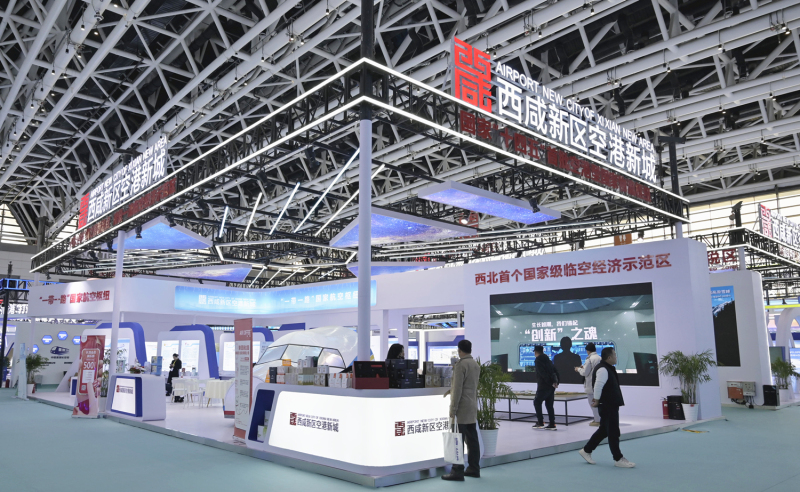 走进西安国际会展中心2号展馆开放平台展区,临空经济示范区和西咸空港综合保税区展区,临空经济特色吸引着来宾参观。